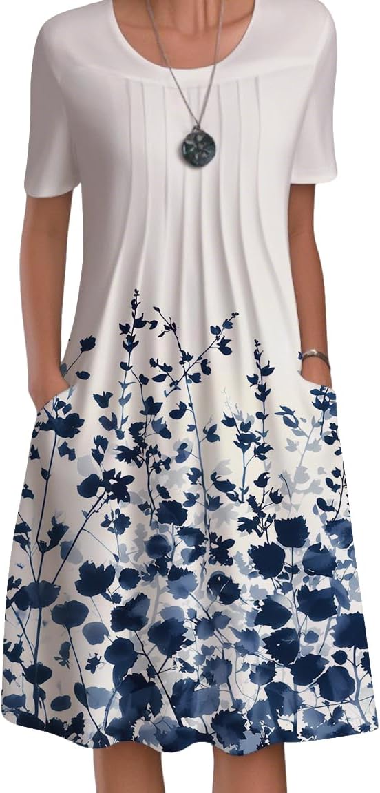 TBILILO Womens Floral Midi Dresses Casual Boho Short Sleeve Flowy Dress Loose Fit Crewneck Summer Vacation Dress with Pockets